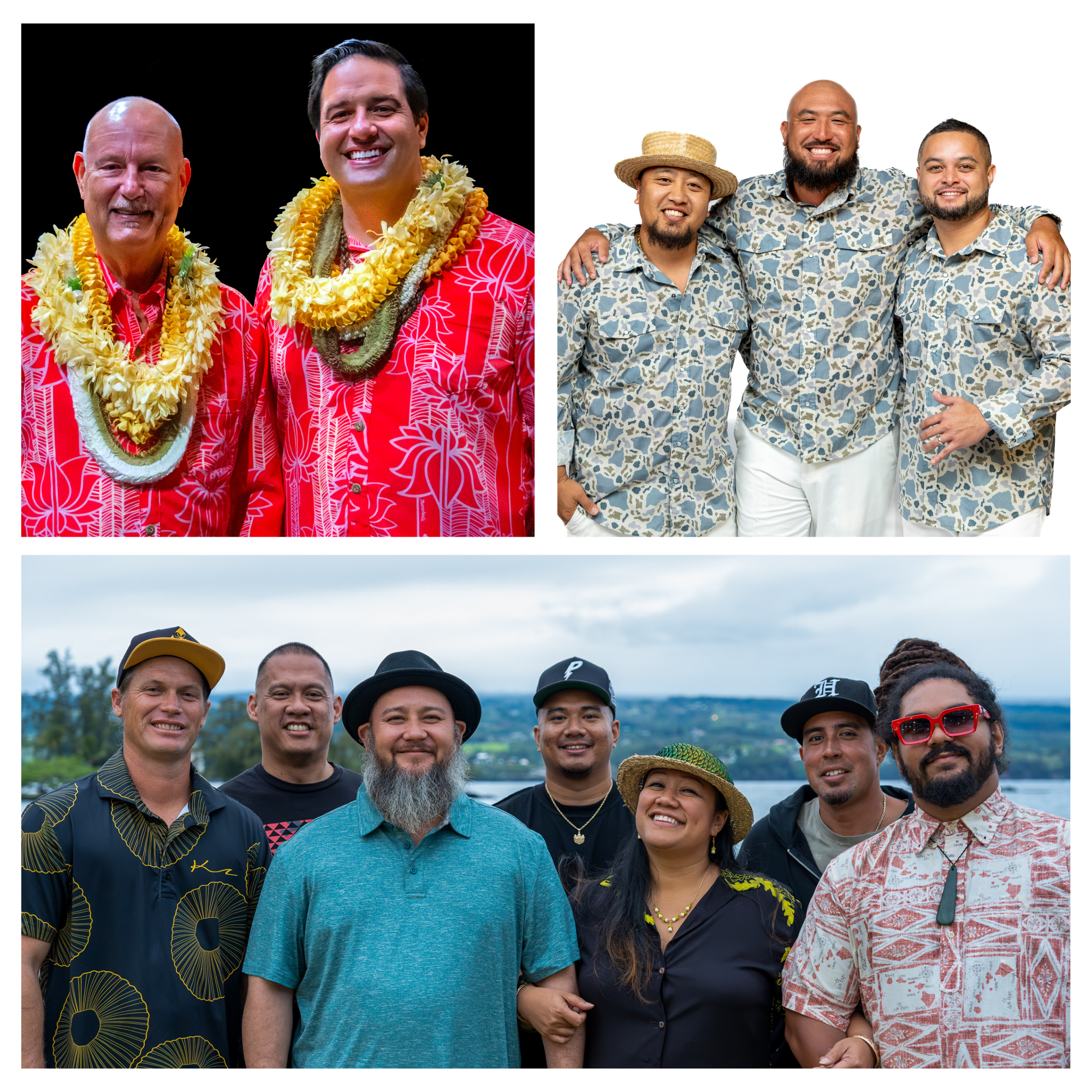 Ei Nei— A Hawaiian music trio composed of Dane Fujiwara (Wailuku), Grant Kono (Oneawa), and Ekolu Chang (Kāneʻohe). Formed in 2016 after each artist had established individual musical paths, Ei Nei quickly gained recognition for their smooth vocal blend, rich harmonies, and deep grounding in mele Hawaiʻi. In 2020, they were awarded the Nā Hōkū Hanohano Award for Most Promising Artist and have since earned multiple nominations. Their music has been featured in film, television, and an Emmy Award–winning documentary. Rooted in tradition while looking forward, Ei Nei offers a thoughtful and contemporary voice in Hawaiian music.